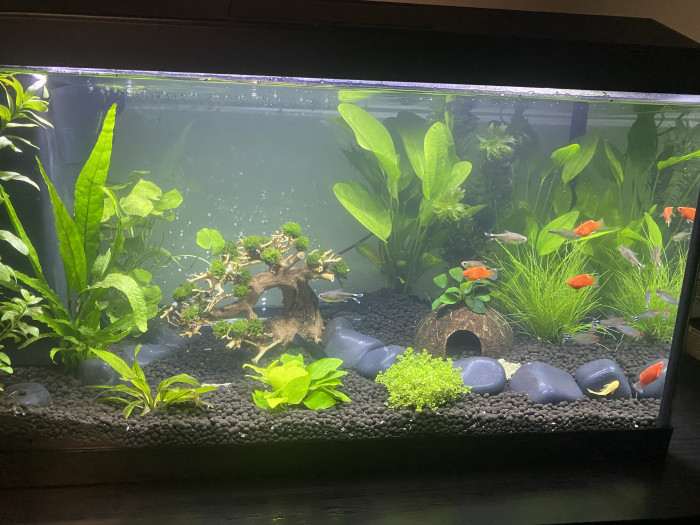máme nové akvárium 60l teprve dva dny, v něm tetru měděnou 5ks tetru červenou 6ks a coral plata skvrnitá 4ks a dva sumecky malé.
