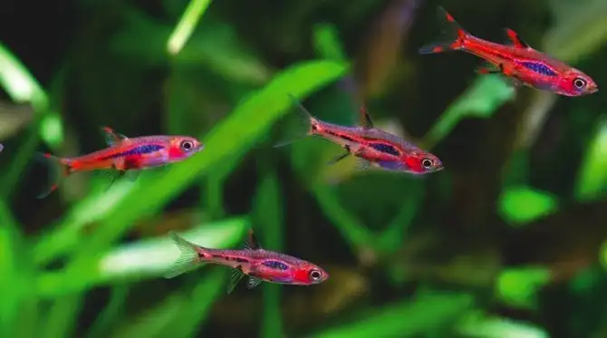 Prodám Razborku bornejskou - Má rudou barvu, podélný černý pruh a červeno-černé ploutve. Malá plachá rybka, která má ráda zarostlou nádrž. Vhodné je chovat s dalšími razborkami nebo v jednodruhové nád...
