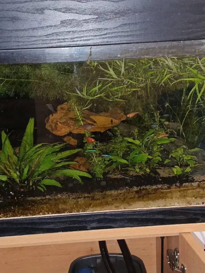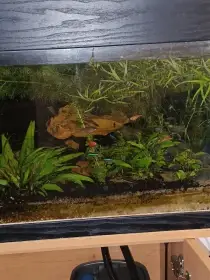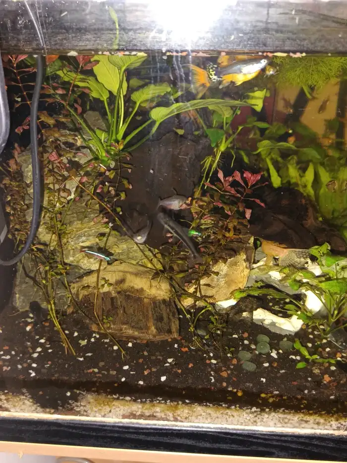 kompletní akvárko 20 litrů, rozměr šířka uprostřed 18 cm, u kraje 14,5cm, délka 44 cm, výška 37,5 cm, včetně vzduchování - kámen, filtr, písek 2 kg, motůrek, kámen bílý, umělé květiny 2 ks, topení, sv...