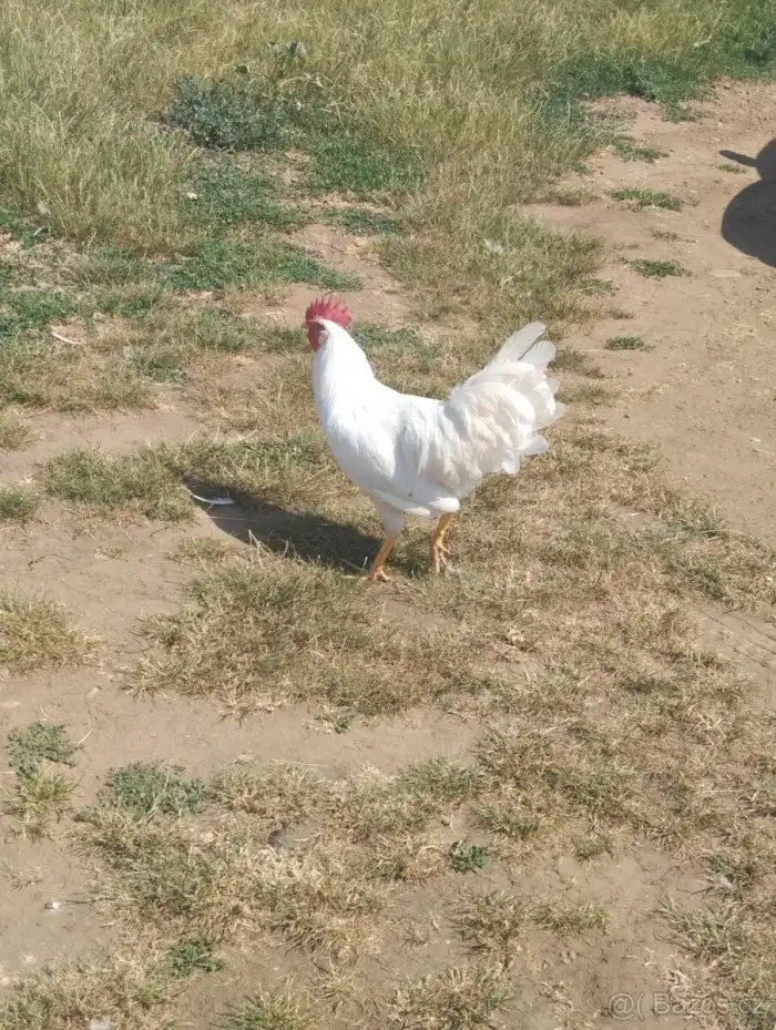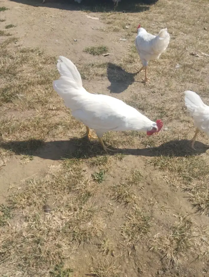 Prodám Leghornky - Nabízím kohouty bílé a červenobílé zbarvení, kříženci leghornek, narozeni 5/2025