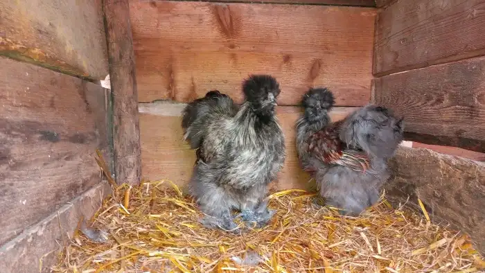 Prodám Hedvábničky - Prodám dvě slepičky a kohouta společně.1000 kč za vše.