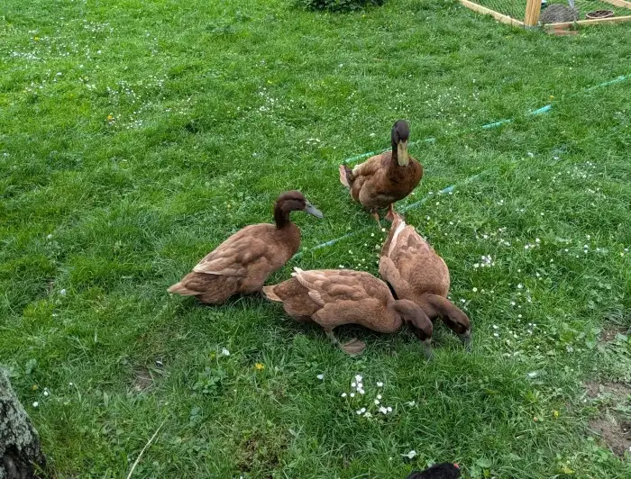 Prodám Kachny pekingské - Prodám přebytek 8ks 10ti denních káčat. Vylíhnuté v líhni. Rodiče jsou na fotce. Kačata jsou již jsou venku, prozatím na hoblinách. Krmení- K1, kopřivy, šrot(kukuřice, pšen...