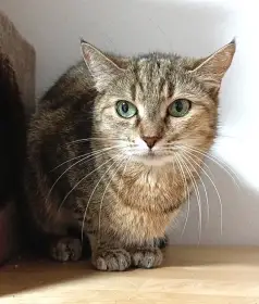 Julča (narozena asi 2023) je drobnější šedá kočička, kterou jsme v lednu přijali spolu s několika dalšími kočkami.