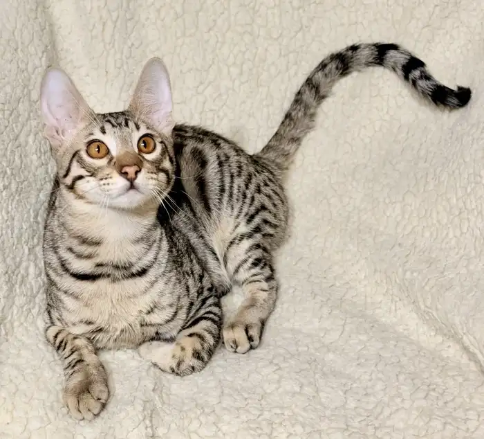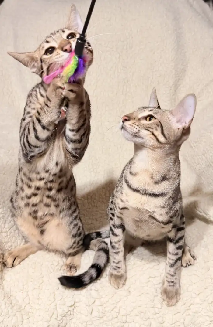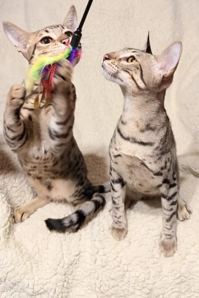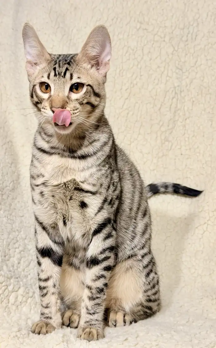 Po svých servalích předcích a rodičích zdědila elegantní, atletickou postavu, dlouhé nohy, výrazné uši a typický šibalský pohled. Pocházejí z plně testovaného chovu, takže zdraví i původ jsou stoprocentní. Samozřejmostí je pravidelné očkování, odčervení a kompletní péče.