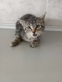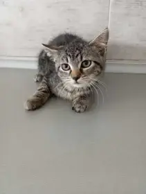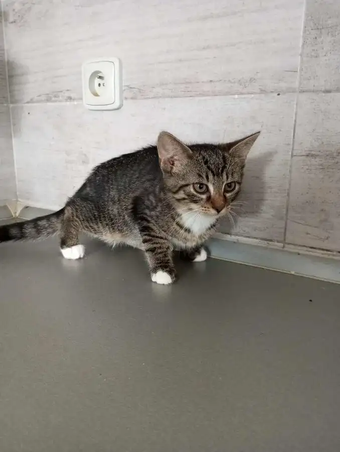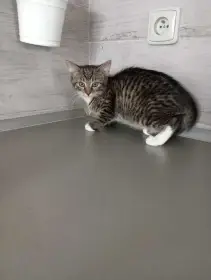 Julča (narozena asi 2023) je drobnější šedá kočička, kterou jsme v lednu přijali spolu s několika dalšími kočkami.