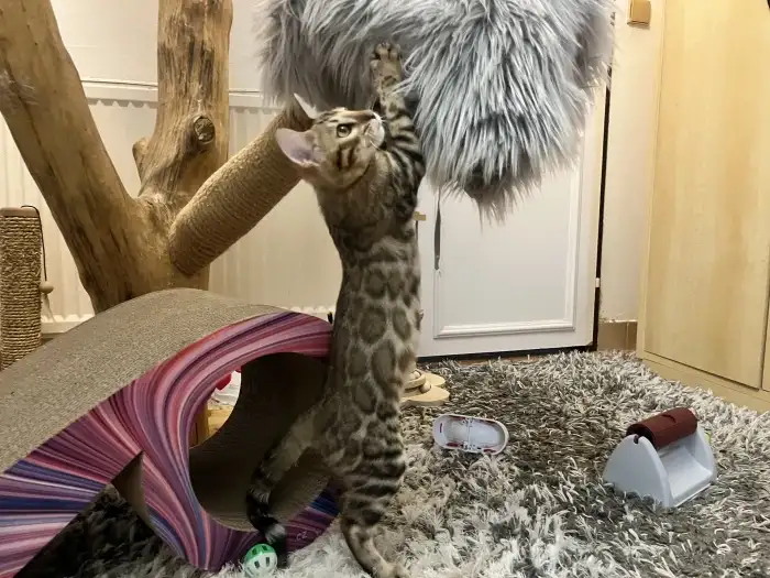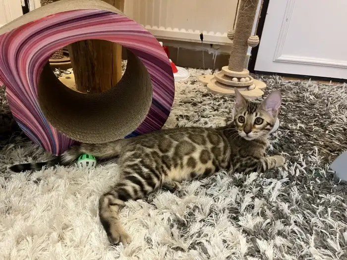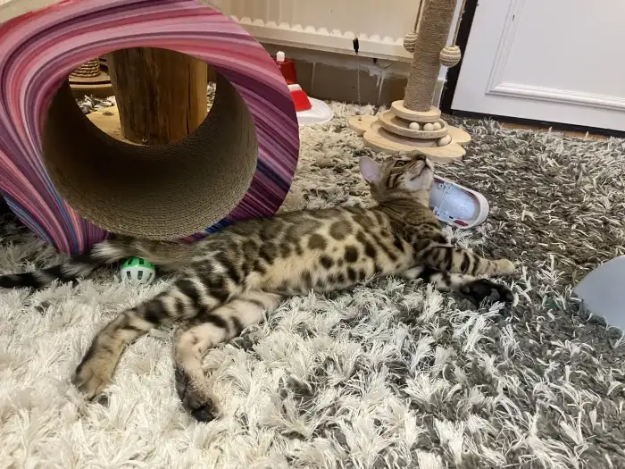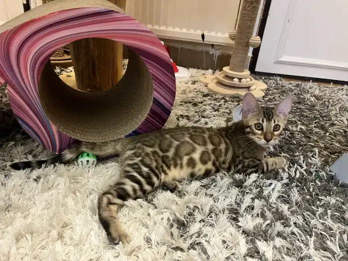 Floki je úžasný typový kocourek s vynikajícím původem, je to velmi statný, dobře stavěný kocourek s pěknou pravidelnou kresbou, má krásnou kulatou hlavičku, malá ouška, silný ocásek a milý obličejík.