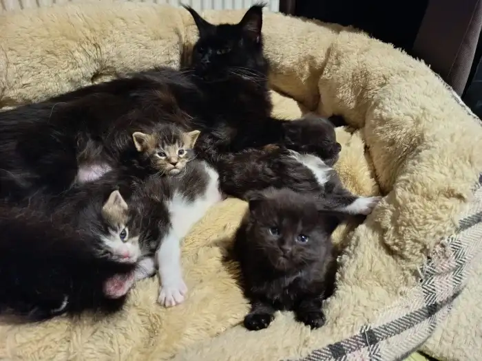 Prodám Mainskou mývalí kočku - Milá a hravá kočička s červeno-bílým kožíškem narozená 15.8.2025 hledá nový domov. Bude se jmenovat od S. Umí chodit na kočičí záchod, je odčervená, očkovaná (i proti Fe...