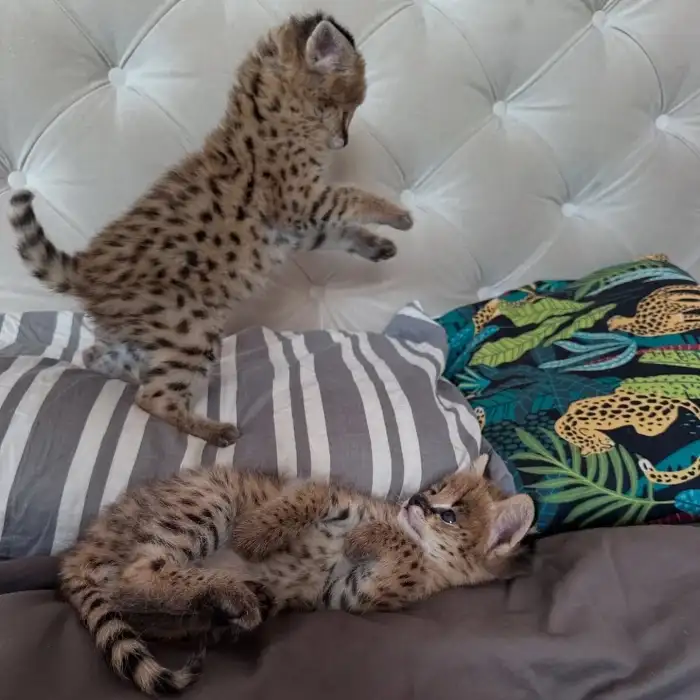 Prodám Savanovou kočku - Hledá se dokonalý domov pro krásná Savannah koťátka F6SBT z CHS Ammy od Skal. K dispozici je jedna holčička a jeden kluk. Naše malé šelmičky s rodokmenem a registrací TICA (US...