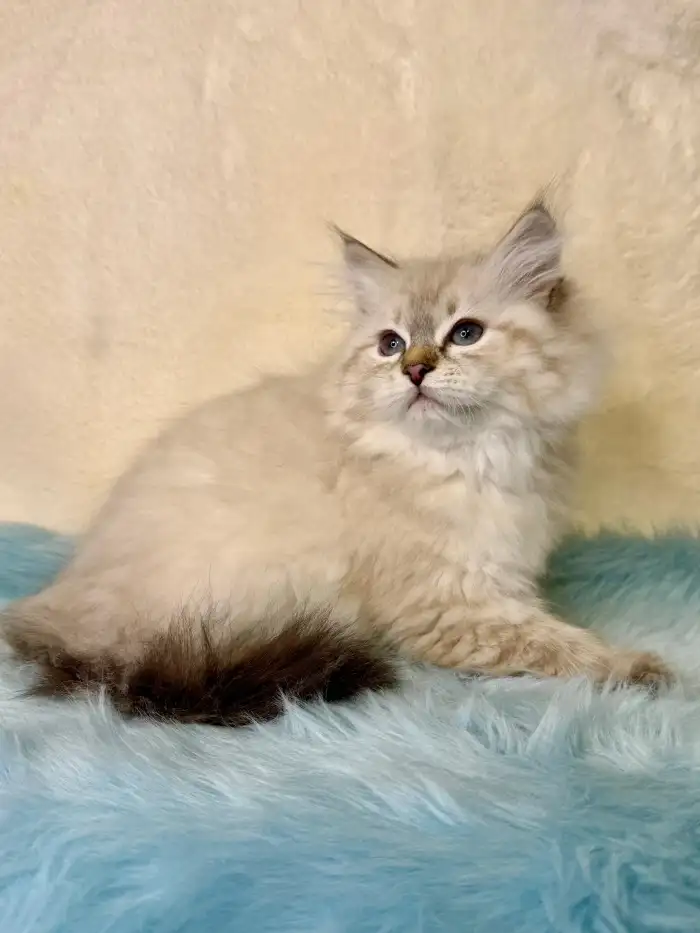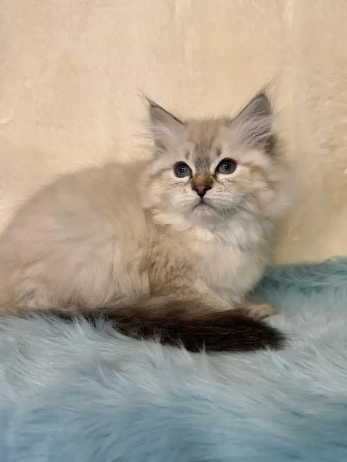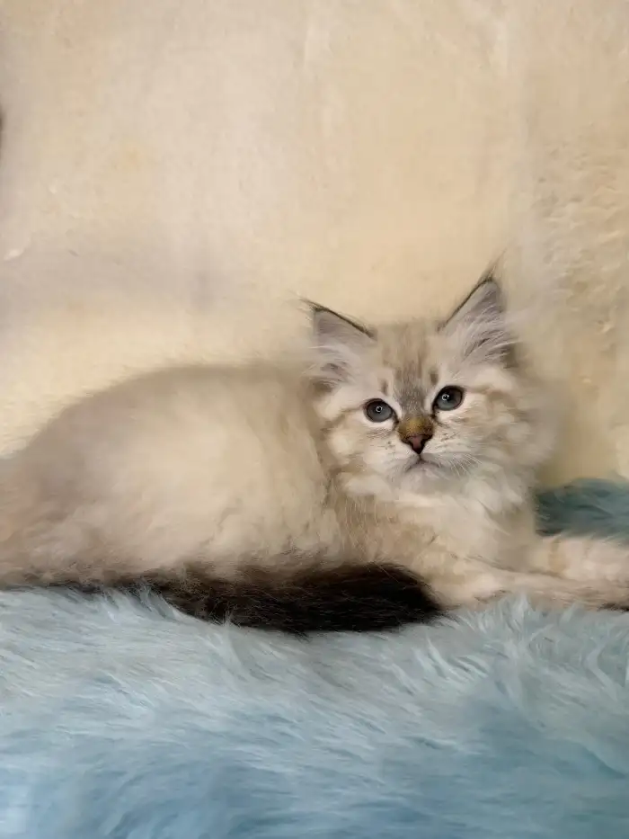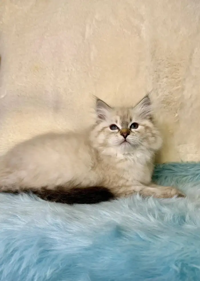 Prodám Něvskou maškarádu - Kayn je náš malý snížek – klidný, vyrovnaný kocourek s jemnou a laskavou povahou. Miluje lidskou blízkost, rád se nechá pochovat a sám se přitulí do náruče, kde tiše přede....