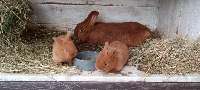 Prodám Novozélandského červeného (Nč) - samce a samice 04/2025 z jednoho vrhu, po oceněných rodičích s PP, očkované mor a myx, netetované