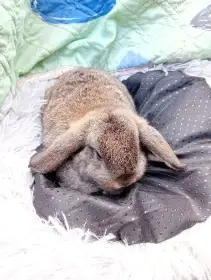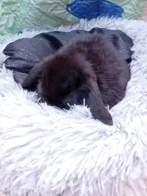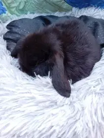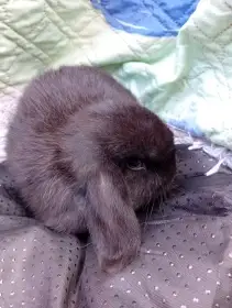 Prodám Zakrslého berana (ZB) - Minilop samička v barvě hnědo - černé s postupným vysvětlováním. Pěkná v typu, klidnější a pohodová. Zvyklá na ruku a častý kontakt. Na fotografiích i se sourozenci....