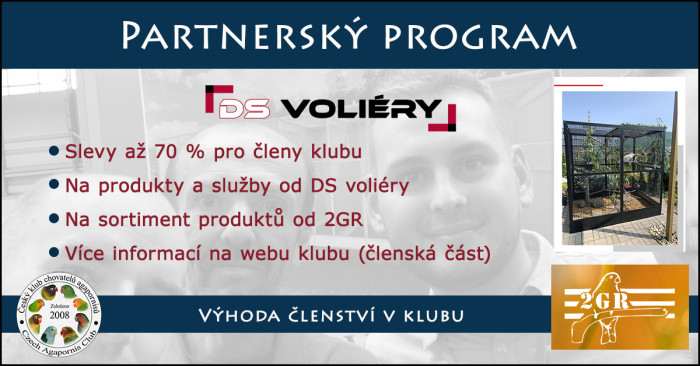 Český klub chovatelů agapornisů dne 14. 3. 2025 podepsal smlouvu o partnerském programu s firmou DS voliéry. Prohlubujeme tak spolupráci s kvalitní společností a to nejen v rámci jejich produktů, ale též jako distributora produktů od společnosti 2GR. Pro členy klubu to znamená slevy ve výši až 70 % na několik stovek položek a možnost výroby klecí a voliér na zakázku za zvýhodněné ceny. Podrobné informace jsou pro členy k dispozici v členské části klubového webu.