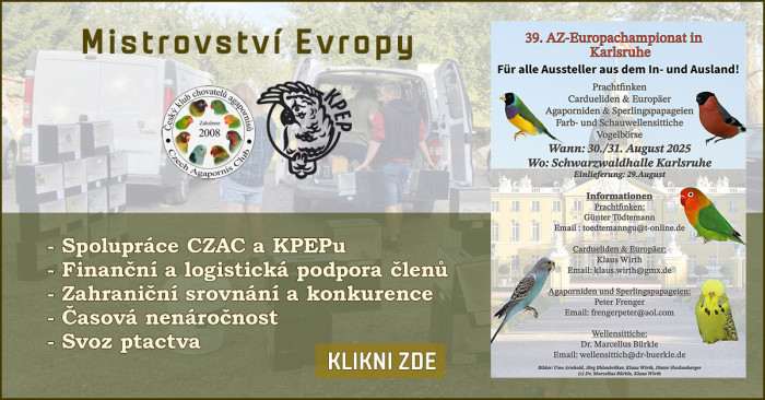 Výstavní sezóna se nám blíží a začínáme zhurta, a to rovnou na Mistrovství Evropy v německém Karlsruhe! Výstava se koná 30. - 31. 8. 2025 a Český klub chovatelů agapornisů ve spolupráci s KPEPem zajišťují pro své členy svoz ptáků. Máme konvojéry, 3 svozová místa, organizačně vše předchystané, pomůžeme s přihláškami, veterinárními dokumenty i administrativou. Náklady dotují oba kluby a sponzoři. Členi tak mají možnost účastnit se jedné z největších a tradičních výstavy Evropy! Za minimální časové i finanční náklady.