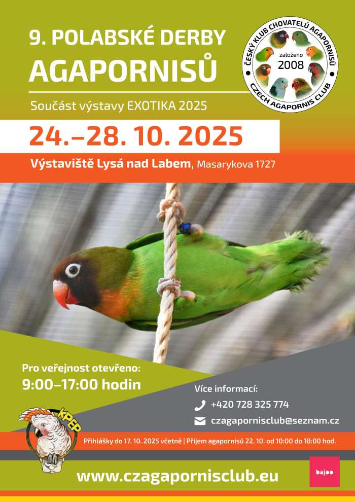 Jedeme dále, za týden 17. Celostátní výstava agapornisů a následně výstavní sezónu uzavřeme na jedné z největších výstav exotických zvířat v Evropě - Exotice v Lysé nad Labem. V rámci ní pořádáme 9. Polabské derby agapornisů. Soutěžní část bude doplněna o prodejní i propagační část, a spolu se stánkem klubu bude zajištěn informační servis pro návštěvníky. Výstava se koná 24. - 28. 10. 2025, příjem přihlášek se uzavírá v pátek 17. 10. 2025.