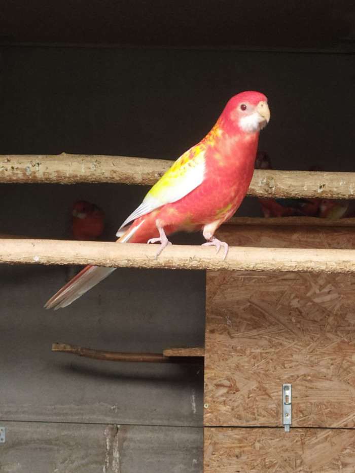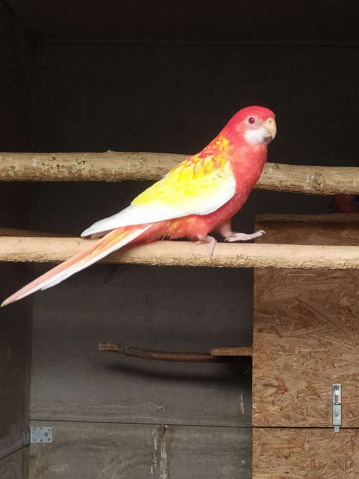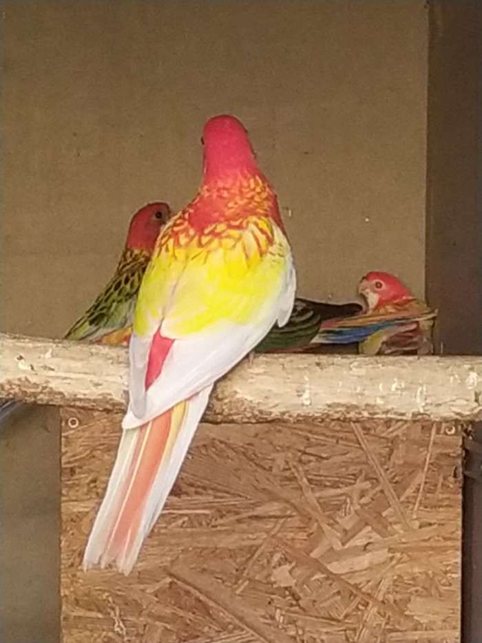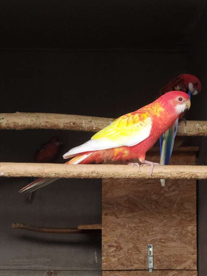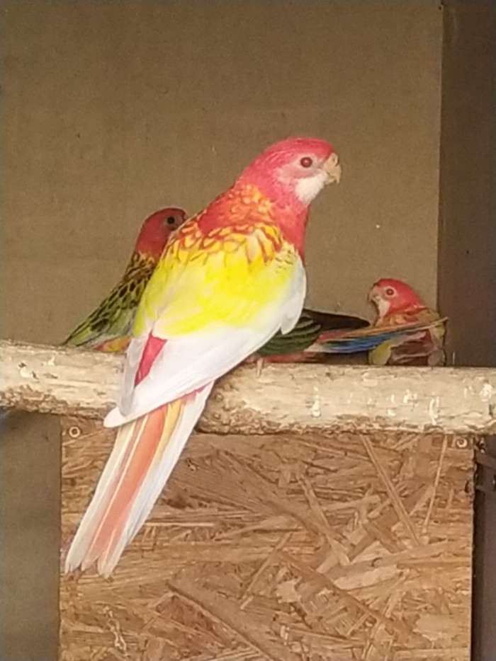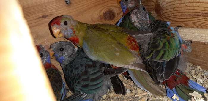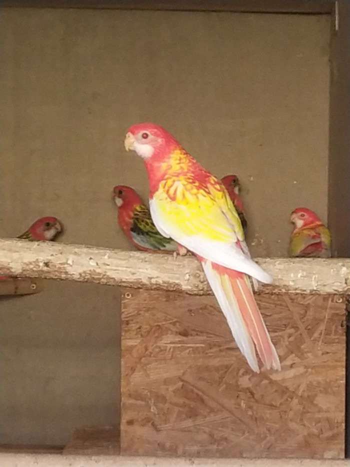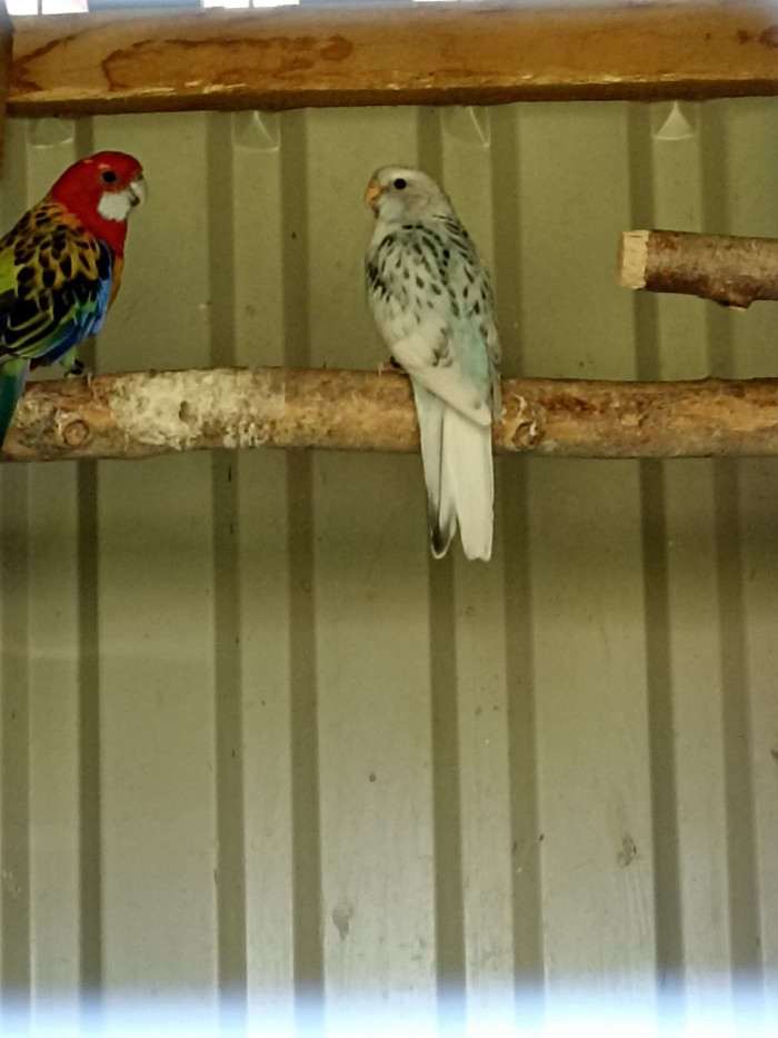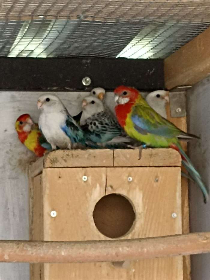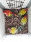 Také už vyletěli, rosela pestrá albino ( skořice) se svým otcem a rubino/modrou.