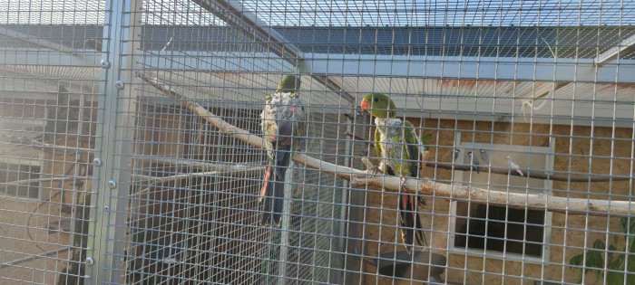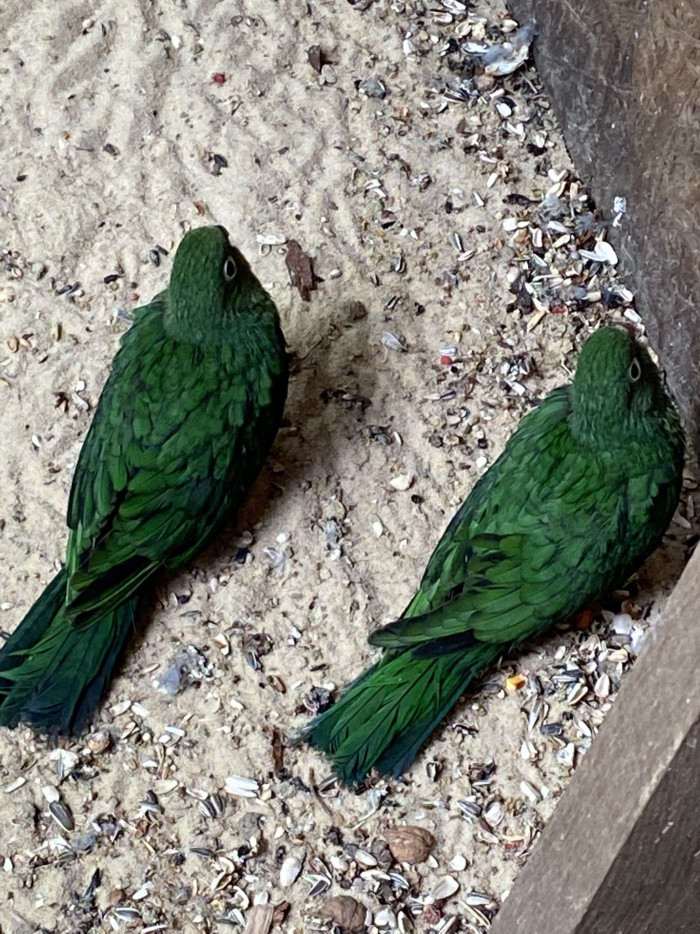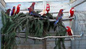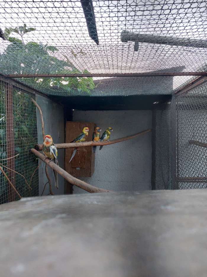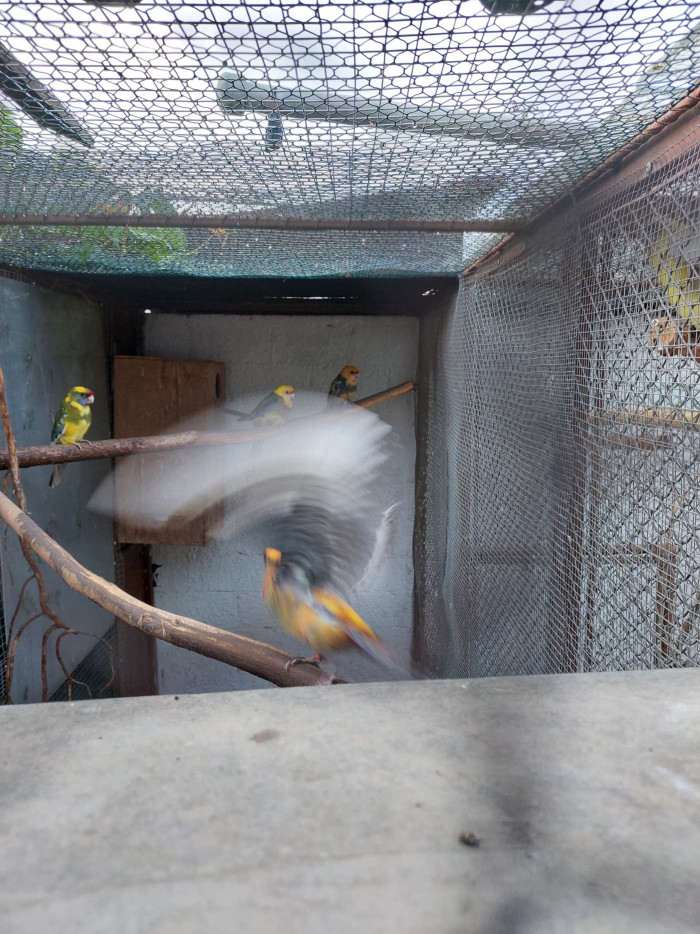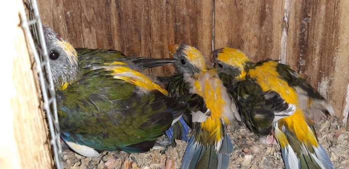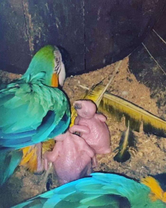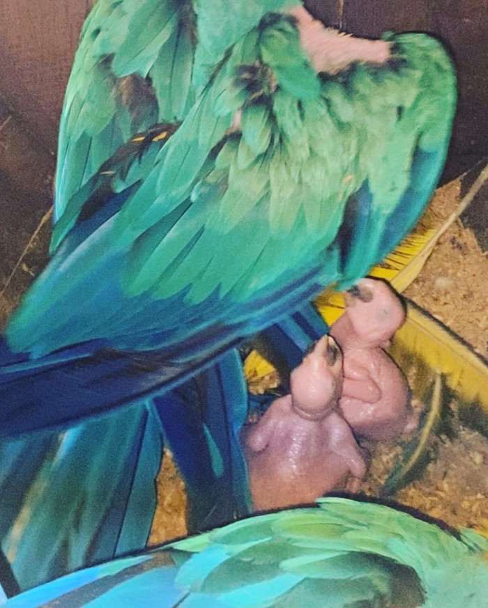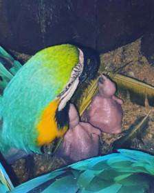 Mlade ary ararauny. Oni su 4 len dve su pod samcom a dve pod samicou a tie dve pod samcom nie je vidiet. stary su strasne agresivny tak ich nechcem moc vyrusovat.
