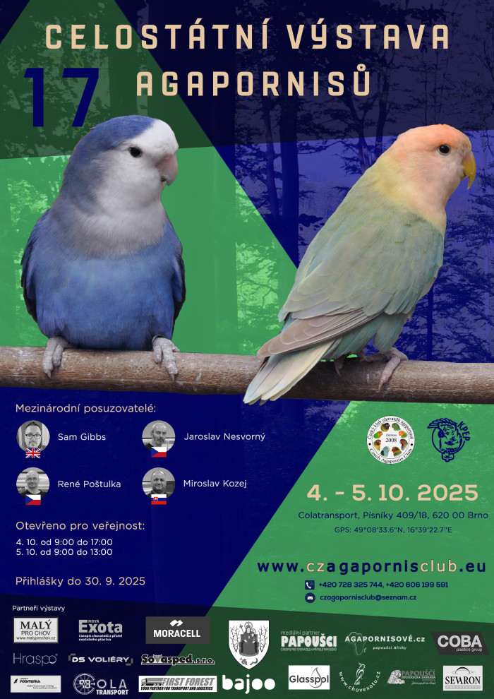 Vážení chovatelé, Český klub chovatelů agapornisů pořádá ve dnech 4. – 5. 10. 2025 v pořadí 17. Celostátní výstavu agapornisů. Za uplynulé roky se výstava rozrostla do rozměrů, kdy loni bylo bodováno přes 450 agapornisů a celkově k vidění na 620 agapornisů od chovatelů z České republiky, Slovenska, Polska, Maďarska a Itálie. Vystavovat může každý chovatel agapornisů bez ohledu na členství v klubu, státní příslušnost, věk, zkušenosti … Jedním z pilířů je objektivita posouzení a je nám ctí, že k zkušeným posuzovatelům letos poprvé v České republice bude u nás na výstavě agapornise posuzovat i světová špička v oboru – Sam Gibbs z Velké Británie! Na webu klubu jsme zveřejnili všechny informace a dokumenty v češtině a angličtině. Příjem přihlášek končí 30. 9. 2025. Hlavní plakát výstavy pak je v 5 jazycích – CZ, PL, HU, EN, IT.