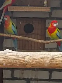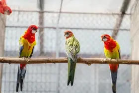Prodám Roselu pestrou - Pro nedostatek místa prodám dvouletý pár Rosel 1,0 červený + 0,1 rubíno z celoroční venkovní voliéry. Letos pár prvně odchoval tři mladé.