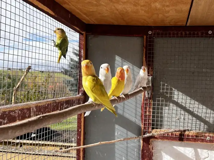 Prodám Agapornise růžohrdlého - Letošní hnízdo. 3x zelený opalin 1x lutino opalin Možnost dopravy po domluvě nebo zaslání kurýrní službou.. Jezdím na burzy..