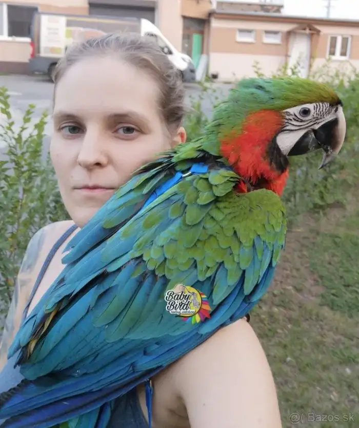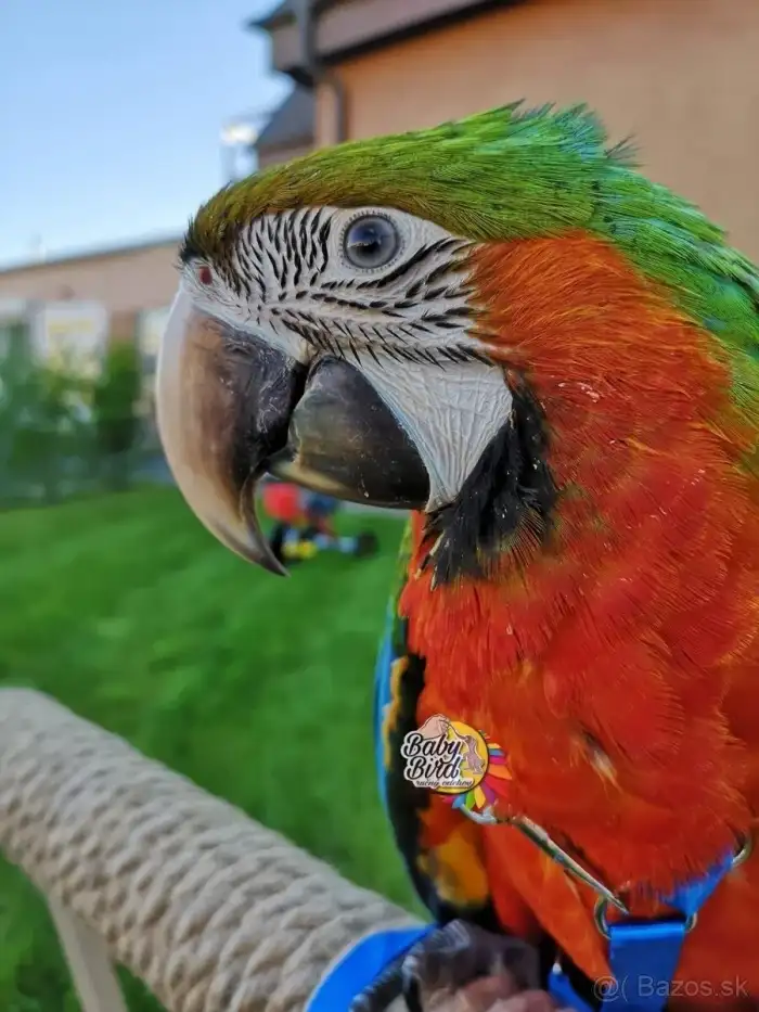 Prodám Aru harlekýna - Prodám chovného samce ara harlekýn rok 2017 pevný kroužek bez vady, nebo koupím straší samici zelenokřídlou, harlekýn, ararauna Tel. 606084094