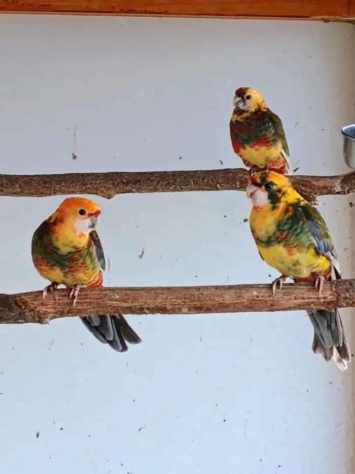 Prodám Roselu penant - Prodám letošní penanty 0.1 žlutý pastel štěp. na 2f ( oranžový) , 1.0 pomerančová skořicová straka štěp. na obrácená straka, a 1.0 obrácená pomerančová straka rok 24 (chovný). M...