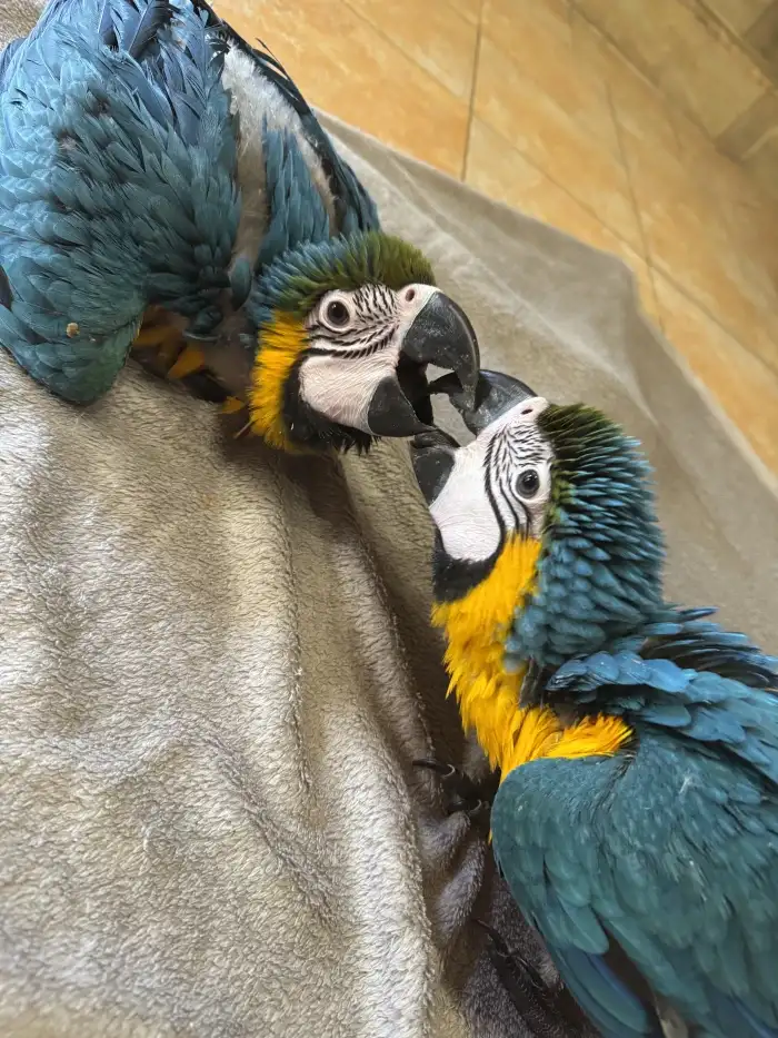 Prodám Aru araraunu - Prodám letošní mladý pár ara ararauna nepříbuzní bez vady jsou ručně dokrmeny testy DNA cena dohodou