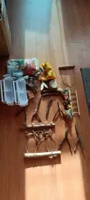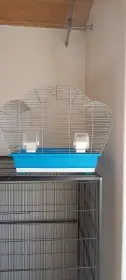 Velká ptačí klec, malá klec, bidýlka a zbytky krmiva