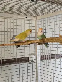 Prodám Agapornise růžohrdlého - Redukce ptactva - stáří údajně rok 2024 (taky jsem koupil) - Hnízdí, ale o vejce se nestarají, takže vhodní spíše pro radost než na chov. - když se naučili na klec,...