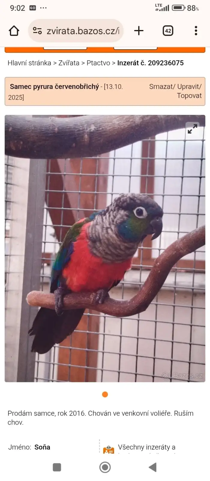 Prodám Pyruru červenobřichého - Prodám 2;0 s DNA certfikátem pevný kroužek 2025 a 2023.