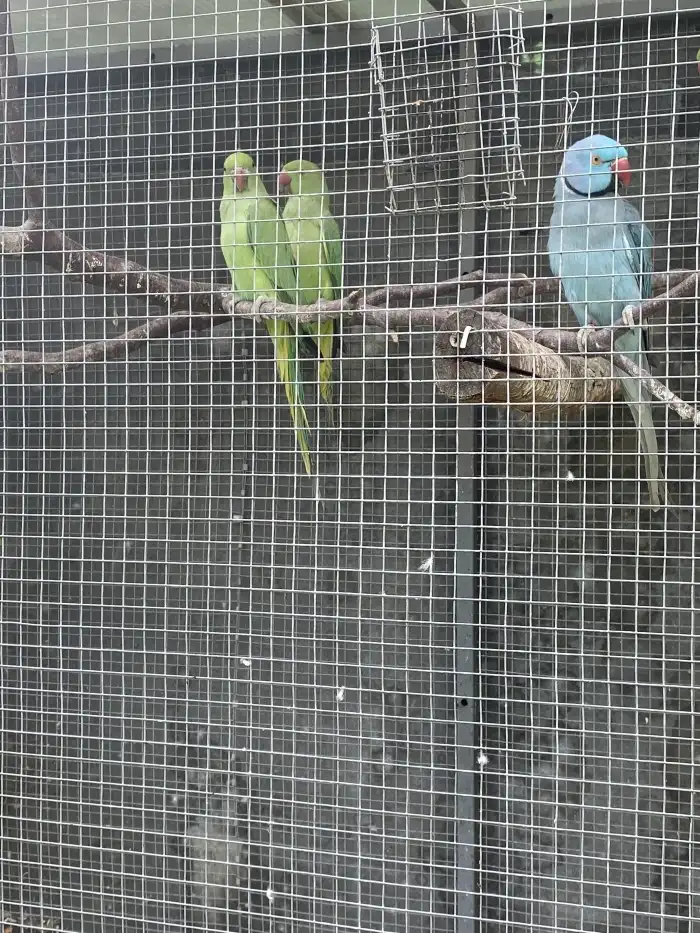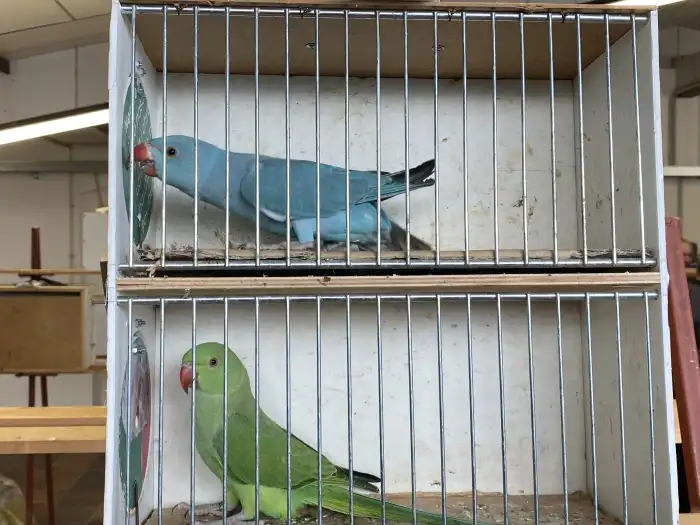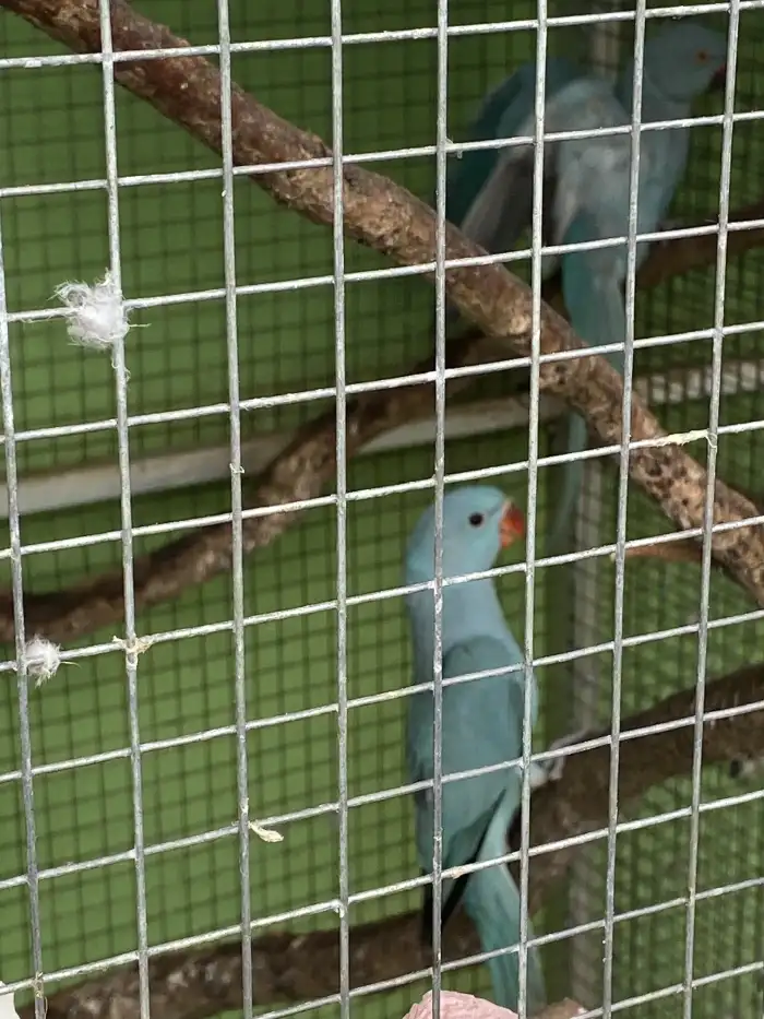 Prodám Alexandra malého - 0,1 2020 modrá violet, má částečně fialová pírka, chybí drápek, cena 600,- Kč