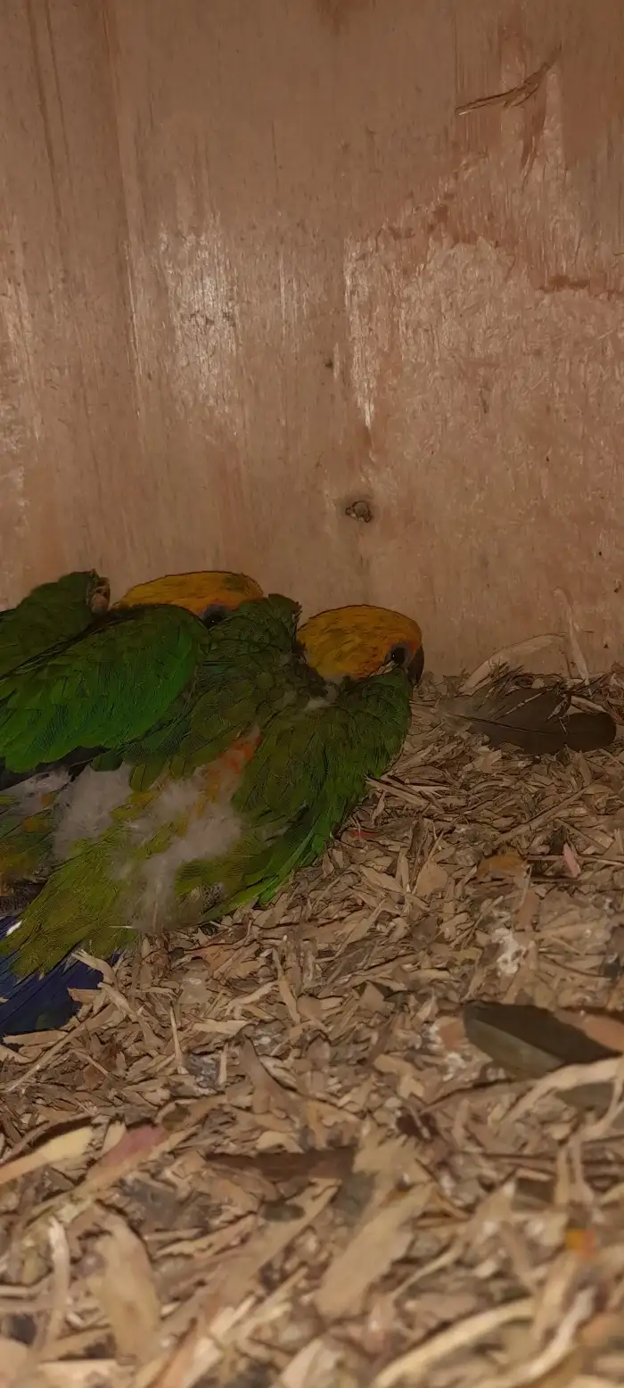 Prodám Aratinga slunečního - 3 samičky aratinga sluneční,odchov pod rodiči,kroužek 2025,pohlaví určeno DNA,možno dovézt na burzy Hodonín nebo Kroměříž.