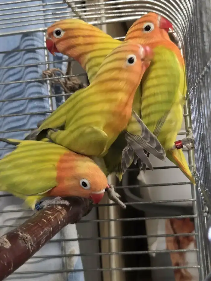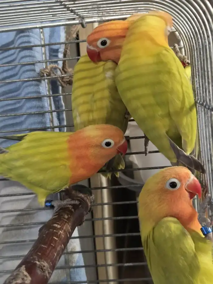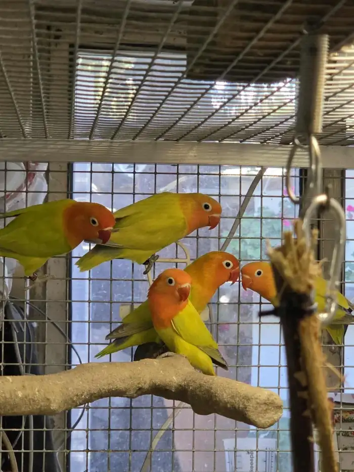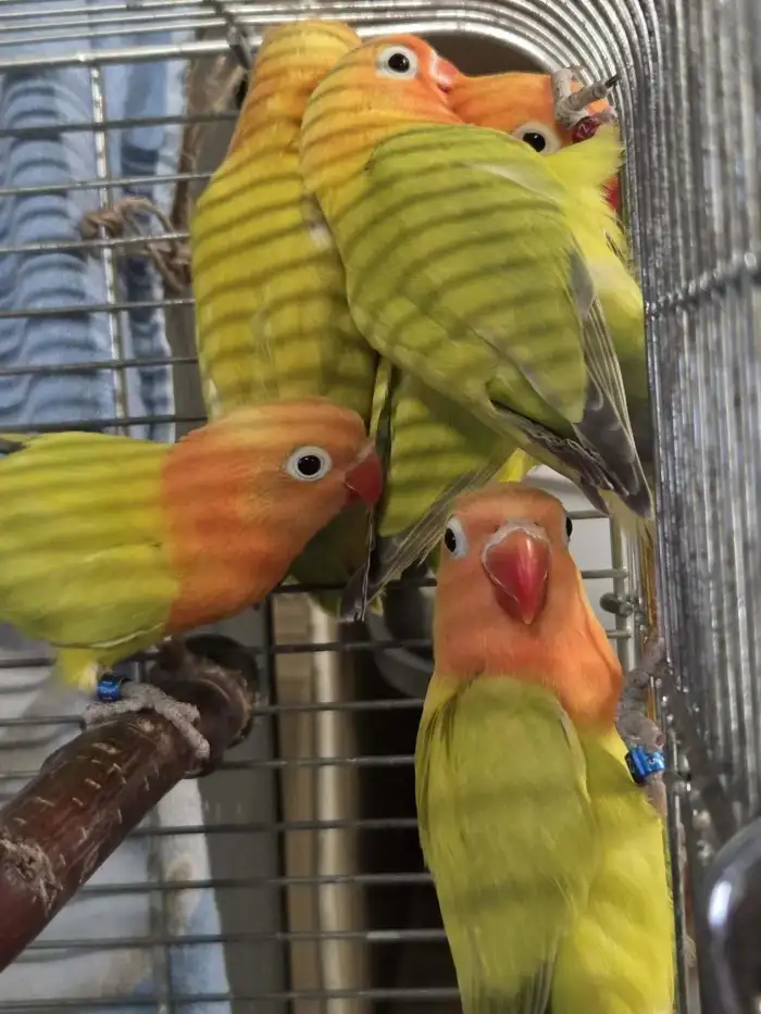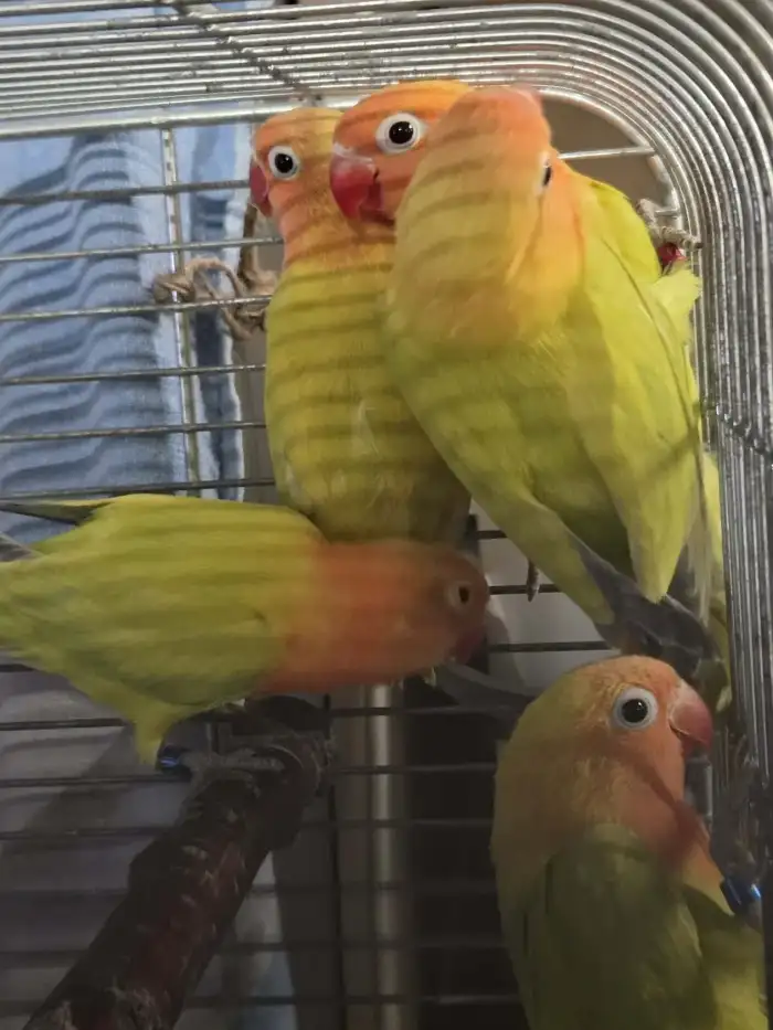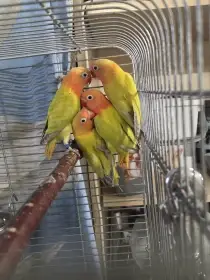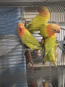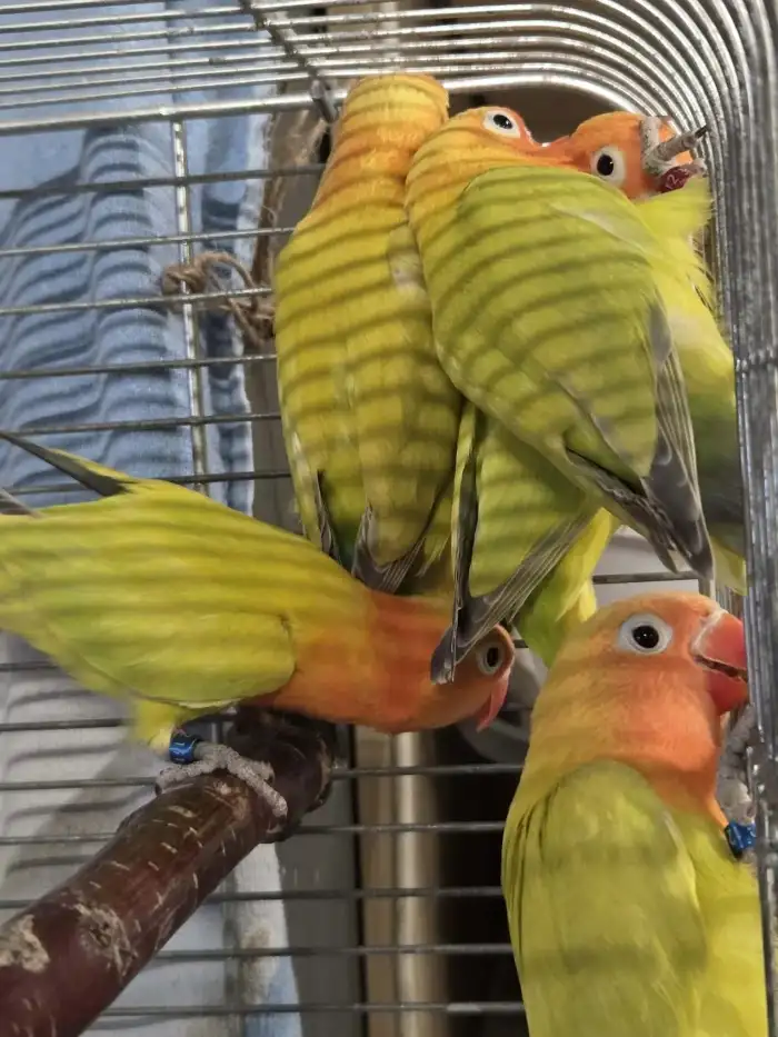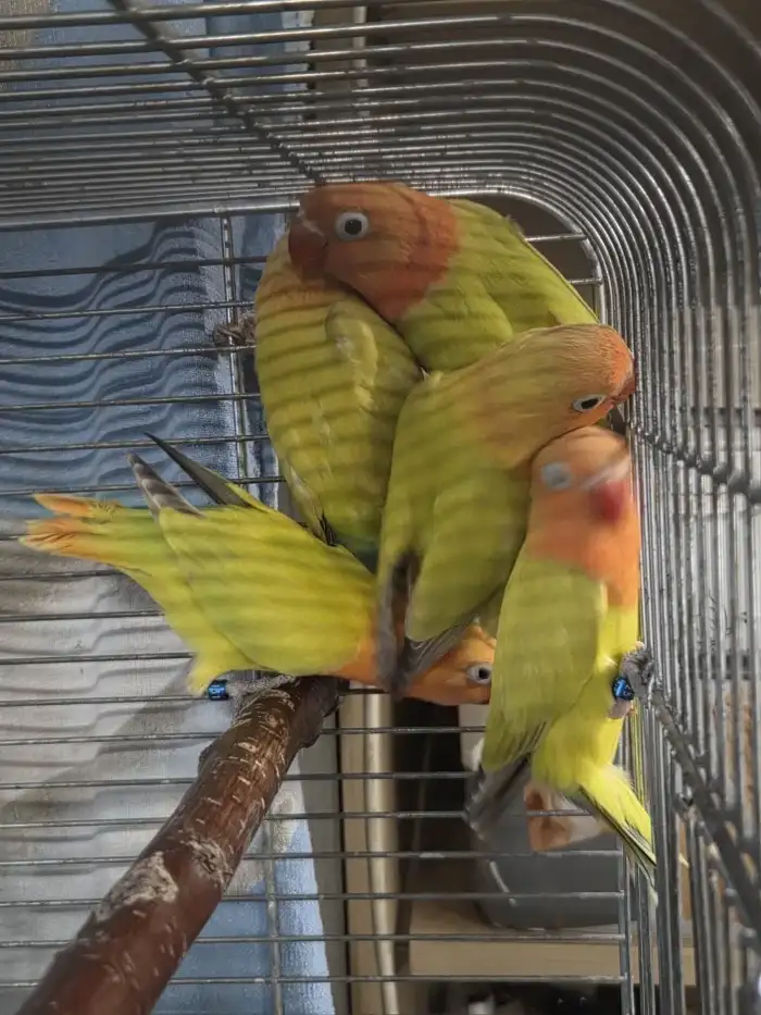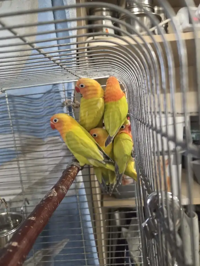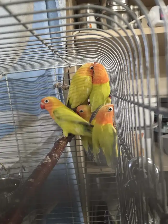 Prodám Agapornise Fišerova - Prodám papoušky Agapornis Fišerův z venkovního chovu, nar. 9/2025, barva 3x přírodní, 3x modrý a tyrkysový. Bez kroužků, bez určení pohlaví. Cena 300-500 Kč dle mutace.