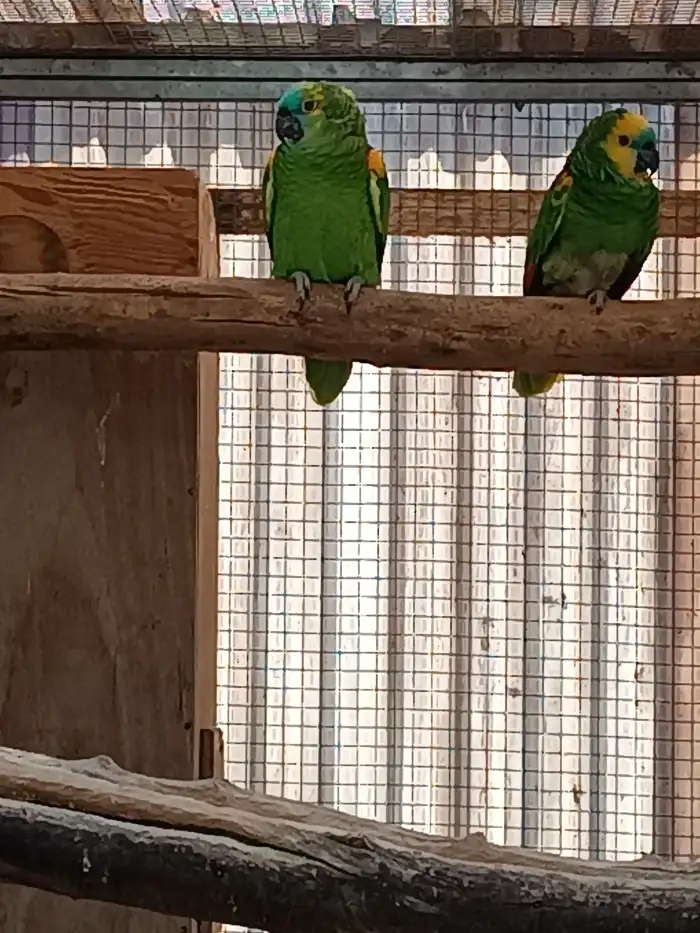 Prodám Amazoňana modročelého - Prodám mláďata z roku 2025, druh : Amazoňan modročelý, na první fotce letošní mláďata vlevo samec (pohlaví určeno DNA) a nejspíš samice (jeho sestra, jsou příbuzní), nej...