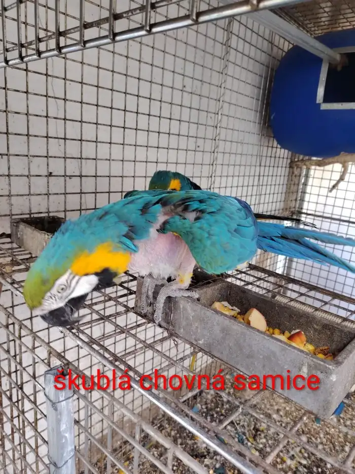 Prodám Aru araraunu - Z rodinných důvodů rušíme chov prodáváme chovného samce (2012). Byl v páru se samicí, která mu začala škubat peří na hlavě a na krku. Samice je již prodaná a peří mu dorůstá. Pro...