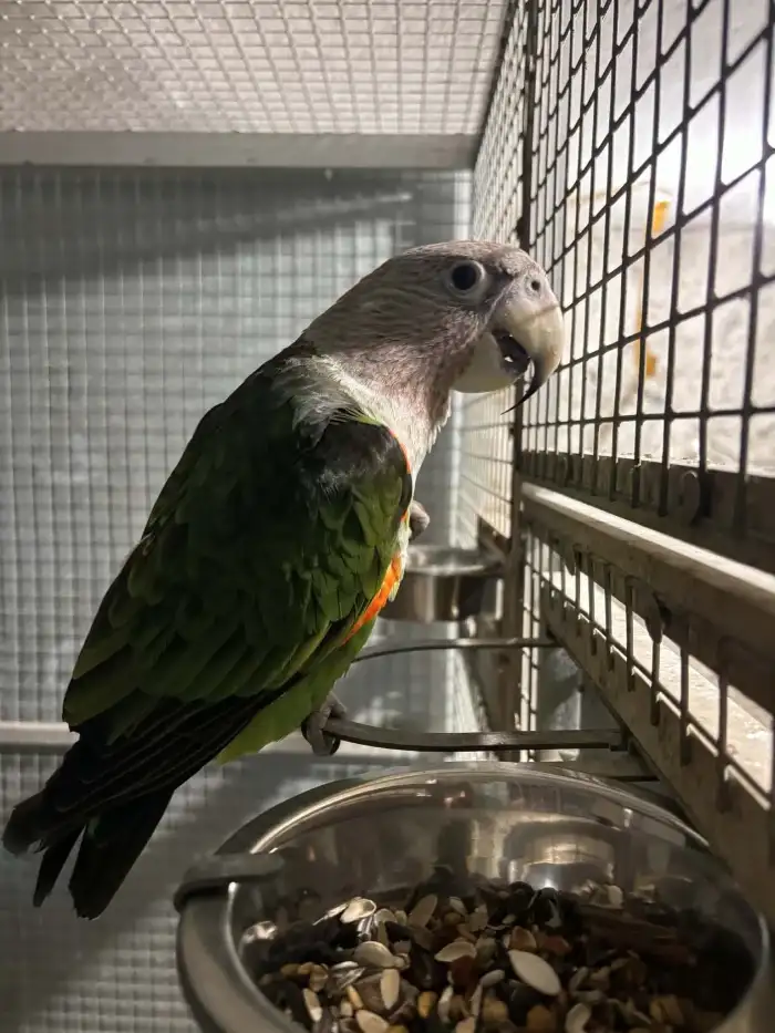 Prodám Papouška kapského - Nabízím samce 2021 čipovaný velký kus. Původ Slovensko . Možná výměna za papoušek hnědý Rüppelli nebo senegalský Wersteri