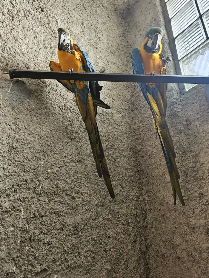 Prodám Aru araraunu - Nepříbuzný pár, 9 měsíců, pevný kroužek, test PBFD negativní, cena v neděli 40000, mají odřené ocasy od klece. Samice 9 měsíců, pevný kroužek, PBFD negativní, 22000, polokrotká.
