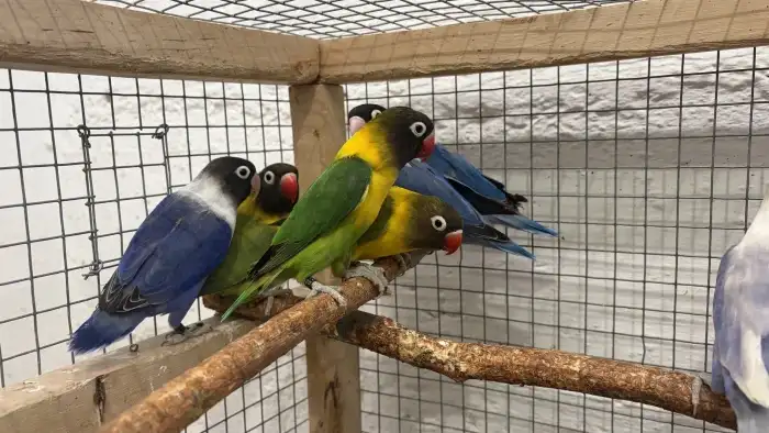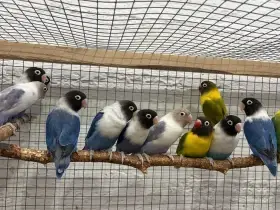 Prodám Agapornise škraboškového - Prodám 3 kusy loňských agapornisu škraboškových, 2 modré tyrkysové, 1 černý. Nekroužkované, bez určení pohlaví. Chované ve venkovní voliéře.