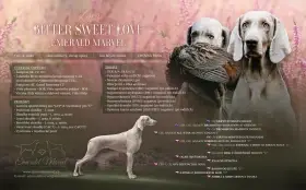 Matka budoucích štěňat je odchovaná v naší CHS – Bitter Sweet Love Emerald Marvel (ZARA) – šampionka krásy několika zemí, vítězka plemene, vítězka třídy šampionů na klubové výstavě, aktivně využívaná v myslivecké praxi. Má složeny všechny typy loveckých zkoušek – podzimní, zkoušky vodní práce, lesní zkoušky, barvářské zkoušky a všestranné zkoušky – vše v I. ceně. Na BZ se umístila na 2. místě z 24 psů. Na VZ získala titul res. CACT. Má nadstandardní zdravotní vyšetření – vyšetření kyčlí a loktů, vyšetření srdce - vše s negativním výsledkem. Po rodičích je negativní na choroby postihující výmarské ohaře – DM, MH, HUU, HYM, SD, DAS.