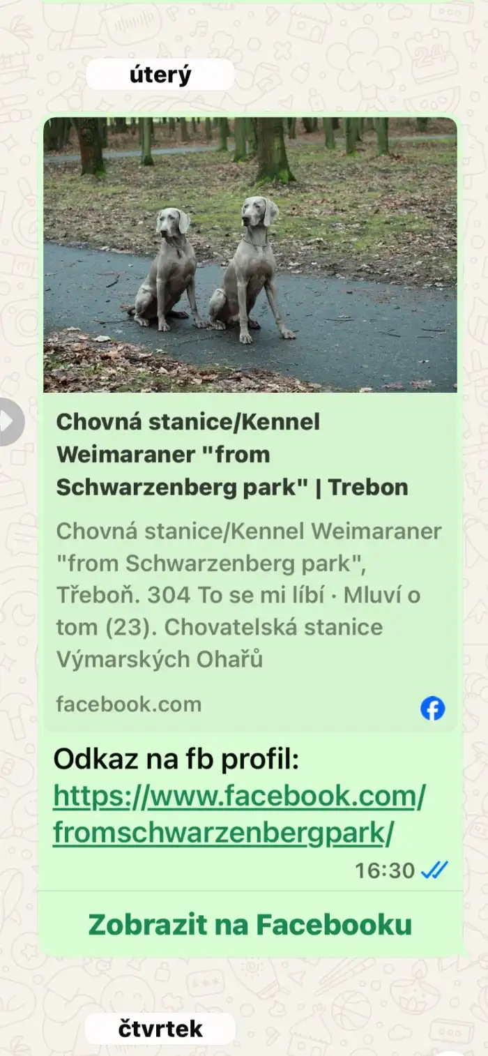 🐾 O nás – Chovatelská stanice výmarských ohařů from Schwarzenberg park 🐾 Jsme rodinná chovatelská stanice výmarských ohařů s dlouholetou láskou k tomuto ušlechtilému plemeni. Od roku 2015 jsme úspěšně odchovali již 7 vrhů zdravých, krásných a vyrovnaných štěňat. Naším cílem je spojení exteriérové kvality s výbornou povahou a pracovními předpoklady. Výmarský ohař je pro nás víc než jen pes – je to věrný společník, pracovitý parťák a člen rodiny. Pečlivě vybíráme chovné jedince s důrazem na zdraví, genetickou vyrovnanost, lovecké vlohy i přátelskou povahu. Naši psi se uplatňují ve sportovní kynologii, lovecké praxi i jako rodinní společníci s potřebou aktivního života. Štěňata odchováváme v domácím prostředí s maximální péčí a láskou, se zaměřením na socializaci, stimulaci a budoucí uplatnění – ať už ve sportu, na mysliveckých zkouškách nebo při společných výletech a hrách s rodinou. 🔍 Máme zájem o zodpovědné nové majitele, kteří hledají parťáka do života – ať už na výcvik, výlety, lov nebo jen jako milujícího člena rodiny. 📞 Pokud vás zajímá víc, rádi vás přivítáme na nezávaznou návštěvu nebo si s vámi popovídáme o všem, co vás zajímá. 📍 Třeboň | 🌐 FB stránka: Chovná stanice/Kennel Weimaraner "from Schwarzenberg park" (https://1url.cz/9JBhs) | ✉️ fromschwarzenberkpark@seznam.cz | 📱 +420 601 272 523