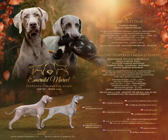 Matka budoucích štěňat je odchovaná v naší CHS – Amazing Huntress Emerald Marvel (SCARLETT) – mezinárodní šampionka, šampionka krásy několika zemí, vítězka plemene, nejlepší mladý jedinec výstavy, aktivně využívaná v myslivecké praxi. Má složeny všechny typy loveckých zkoušek – podzimní (2. místo), zkoušky vodní práce, lesní zkoušky (vítěz), barvářské zkoušky (2.místo) a všestranné zkoušky. Má nadstandardní zdravotní vyšetření – vyšetření kyčlí a loktů, vyšetření srdce - vše s negativním výsledkem. Po rodičích je negativní na choroby postihující výmarské ohaře – DM, MH, HUU, HYM, SD, DAS.