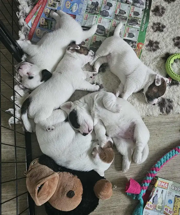 Prodám Jack Russell teriéra - Chovná stanice Z Kusalova hledá milující domov pro 2 pejsky a 2 fenečky JRT s PP. Štěňátka narozená 7.8.2025 mají broken srst, jsou vymazlená.Oba rodiče jsou zdravotně vy...