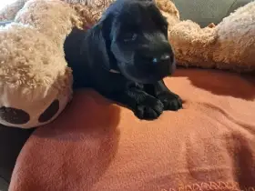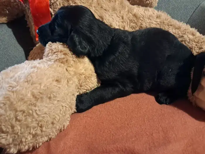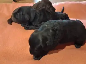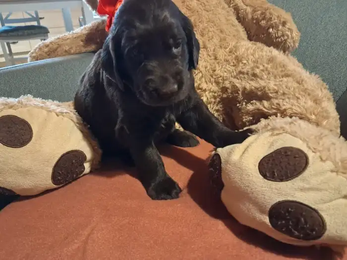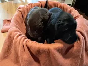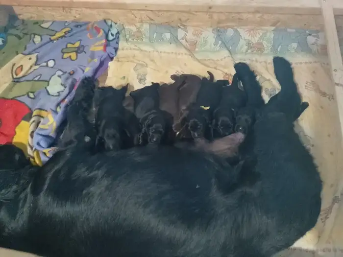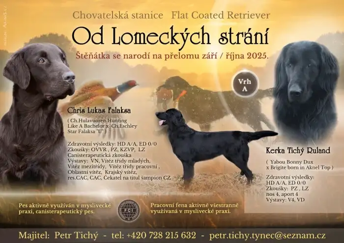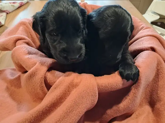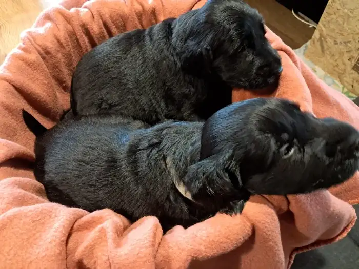 Prodám Flat coated retrívra - Zadám černá a hnědá štěňata (bez žluté vlohy), kombinace švédsko-anglicko-německé krve, odběr v polovině února 2026. Otec: Erix Point of View „Paule“ (DE), šampion, pr...