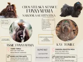 Chovatelská stanice Funnymama se nachází v Brně a zaměřuje se na chov plemene ruská barevná boloňka. Mým cílem je spojit krásu, zdraví a vyrovnanou povahu tohoto elegantního a přátelského plemene. Základem mého chovu je hnědá fena Assie (říkám jí Afu), která je vyšetřena dle platných chovatelských standardů. Assie je mimořádně oddaná, laskavá a veselá společnice s výbornou povahou, kterou se snaží předávat i svým štěňatům. Štěňátka jsou odchovány v domácím prostředí, kde jsou od prvních dnů obklopena péčí, láskou a běžným rodinným životem. Chov neprovozuji ve velkém - věnuji se mu především z lásky k plemeni, ke štěňatům a z přání zachovat po mojí feně Assie její výjimečné vlastnosti. Každé štěně je pro mne jedinečné a jeho spokojenost i budoucí domov jsou pro mě vždy na prvním místě.