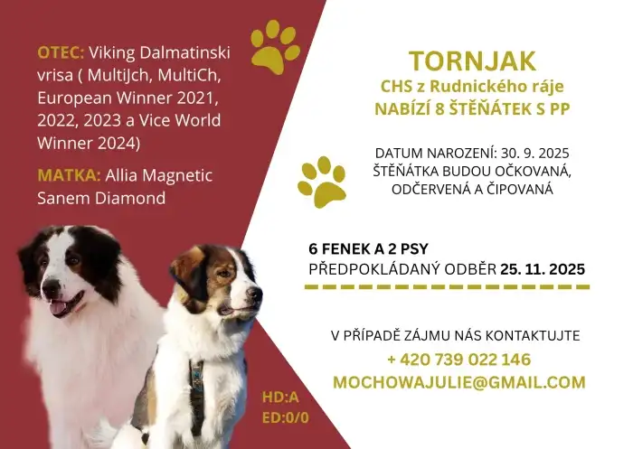 Hledáme majitele pro 4 krásné štěňátka Border kolie, narozené 24. 9. 2025. K odběru ihned. K dispozici jsou 3 fenečky a 1 pejsek. Štěňata jsou čipovaná, odčervená a očkovaná. Hravá, mazlivá, zvykl...