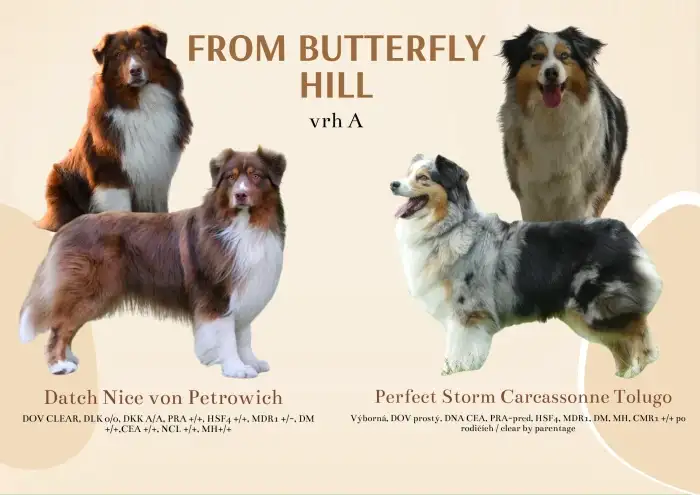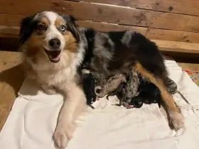 Chovatelská stanice nabízí štěňátka australských ovčáků s PP, nar.: 26. 7. 2025.
