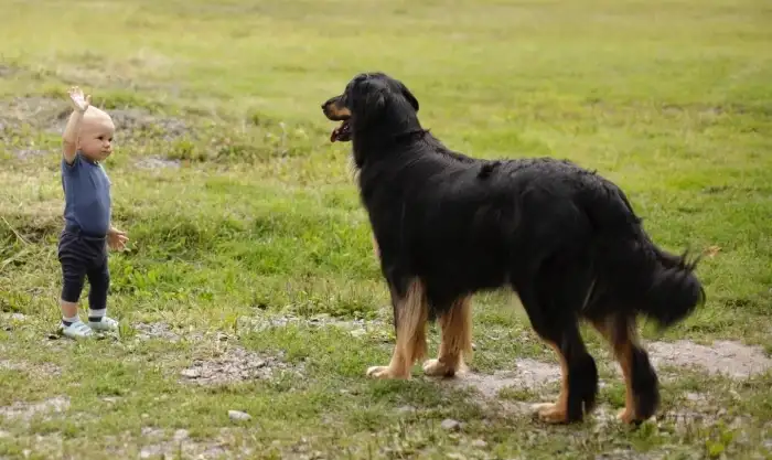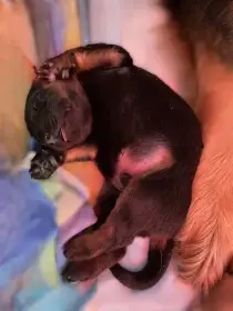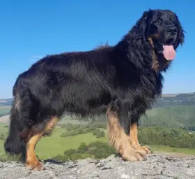 Pes černý se znaky, temperamentní krasavec, skutečný parťák do života, velmi pracovitý borec, odvážný, přátelský k dětem, neagresivní k psům.