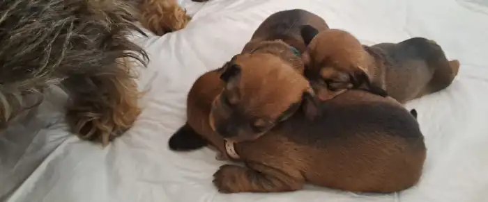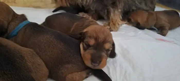 Prodám Jezevčíka drsnosrstého - Chovatelská stanice od Bleskového posedu ⚡️zadá štěňátka z vrhu a ve složení 3 feny (divočák) a 1 pes (černý s pálením) ze spojení Cubo Jasovskej skaly a Becky z Březn...