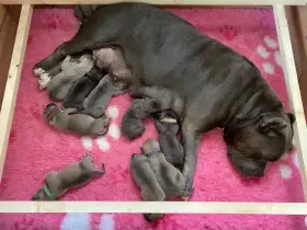 ✅ Exteriér: Genetický předpoklad pro mohutnou stavbu těla, výrazné svaly a ušlechtilý výraz, štěňata jsou velice nadějná pro výstavní kruh.