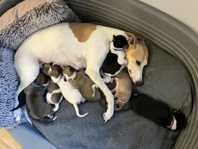 Maminkou štěňátek je přímo naše odchovankyně Bibi neboli Angel Star Fast Beat, po níž máme doma dceru Dori s perfektní povahou a láskou k našim dětem. Bibi má jak dostihovou tak coursingovou licenci a neztratí se ani ve výstavním kruhu. S naším synem se účastni soutěží Dítě a pes, je to skvělá parťačka jak do sportu, tak na výlety a naopak umí také lenošit a pořádně se najíst. Tatínkem je skvělý závodník a krásný pes Jackson Inventum, který na první pohled zaujme svou temně černou barvou a nádhernou bílou lysinkou. Jackson je nejen vášnivý závodník, ale především pes, co je skvělým parťákem a miluje ostatní psy a lidi. Jedná se o rodiče s vyrovnanou a velmi přátelskou povahou, kteří aktivně běhají a těší se pevnému zdraví. Oba rodiče mají zdravotní testy - vyšetření srdce a myostatin s výsledkem N/N. Každopádně nejdůležitější je jejich vyrovnaná, přátelská a milující povaha, kterou předávají svým potomkům a ty dělají radost malým i velkým majitelům.