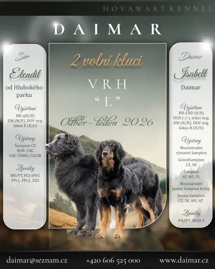 🐶 Povaha – oba rodiče jsou vyrovnaní, s typickou hovawartí povahou, takže štěňata budou spolehliví a milující parťáci. Štěňátka od nás jsou extra vymazlená a kontaktní.